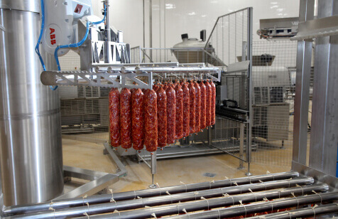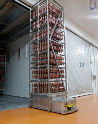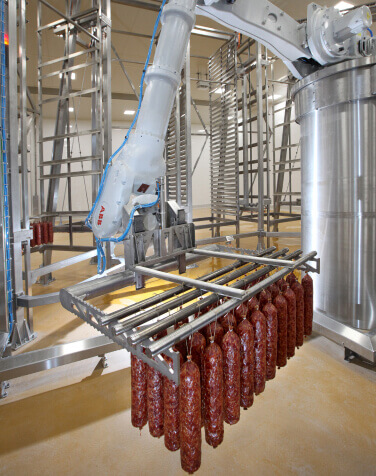 Следующий этап будут сопровождать одни из самых высокотехнологичных машин. Роборука подвешивает батоны ровными рядами на рамы весом в тонну, специальные шаттлы Techno Ferrari забирают рамы с продукцией и везут их в помещения сушки и ферментации, где будущий сальчичон проведет самое долгое время.