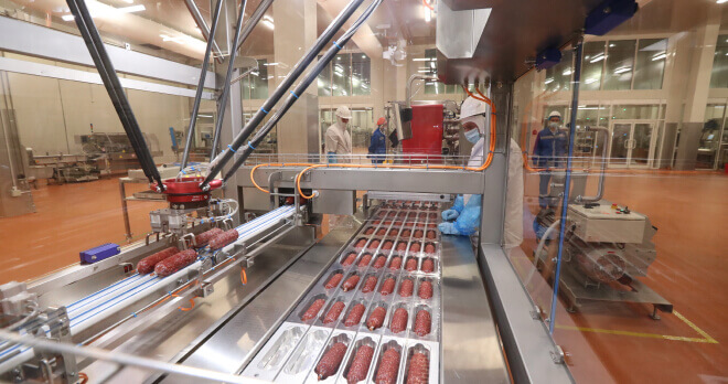 «Черкизово-Кашира» — один из самых роботизированных заводов по производству сырокопченой колбасы в мире. Он открылся в 2018 году и стал первым в отрасли предприятием, в основу которого были заложены принципы индустрии 4.0: более 90% трудоемких процессов здесь выполняют роботы.